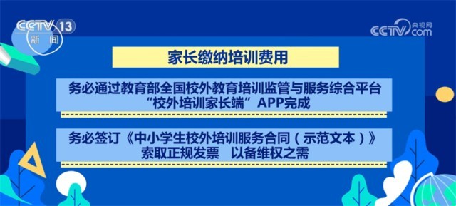 家長繳納培訓(xùn)費(fèi)用,務(wù)必通過教育部全國校外教育培訓(xùn)監(jiān)管與服務(wù)綜合平臺“校外培訓(xùn)家長端”APP完成;務(wù)必簽訂《中小學(xué)生校外培訓(xùn)服務(wù)合同(示范文本)》,索取正規(guī)發(fā)票,以備維權(quán)之需;務(wù)必控制額度,一次性繳費(fèi)不要超過3個月或60課時,且不要超過5000元,切勿受“充值贈送”等方式誘惑,繳納高額培訓(xùn)費(fèi)。