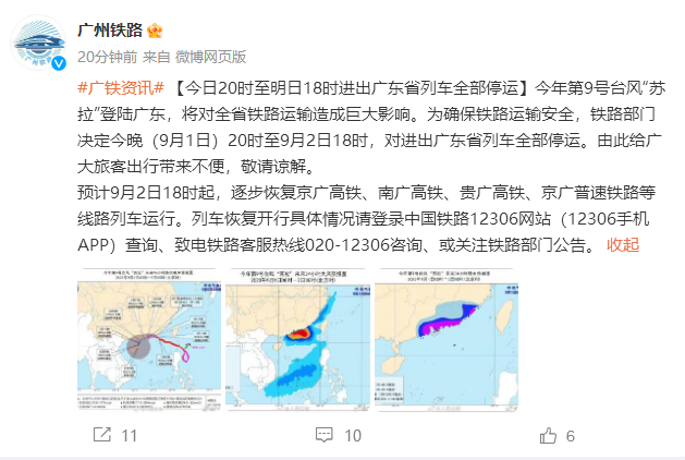 今年第9號臺風“蘇拉”登陸廣東,將對全省鐵路運輸造成巨大影響。為確保鐵路運輸安全,鐵路部門決定今晚(9月1日)20時至9月2日18時,對進出廣東省列車全部停運。由此給廣大旅客出行帶來不便,敬請諒解。