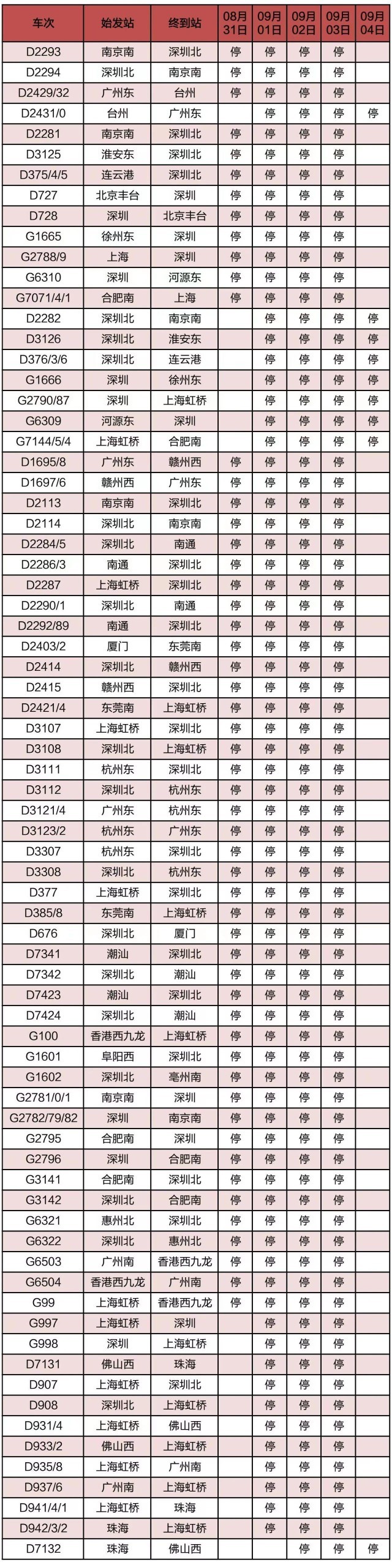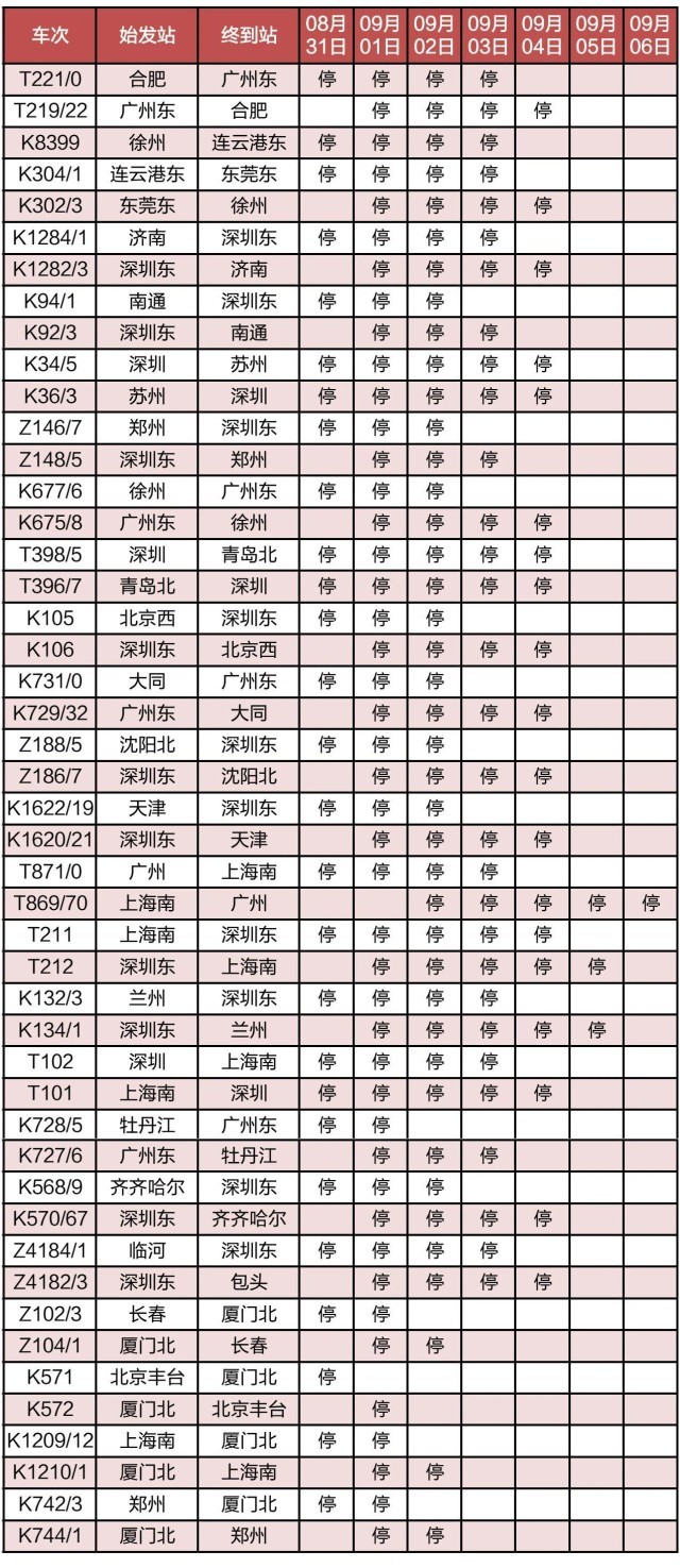 “長(zhǎng)三角鐵路”消息:受第9號(hào)臺(tái)風(fēng)“蘇拉”影響,為確保列車(chē)運(yùn)行安全,鐵路部門(mén)計(jì)劃對(duì)杭深線、京港高鐵、廣深城際、廣深港高鐵、穗深城際、京九線等線路運(yùn)行的部分列車(chē)采取停運(yùn)措施,計(jì)劃停運(yùn)8月31日至9月6日間共121趟旅客列車(chē):其中停運(yùn)動(dòng)車(chē)組列車(chē)74趟,停運(yùn)普速列車(chē)47趟。(停運(yùn)列車(chē)車(chē)次信息見(jiàn)附表)