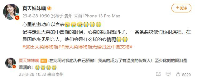 預(yù)告片發(fā)布后,up主“夏天妹妹噢”難掩激動(dòng)之情,她清楚地記得自己走進(jìn)大英博物館的中國(guó)館時(shí),心真的狠狠顫抖了。“一條條裂紋他們也很痛吧,在異國(guó)他鄉(xiāng)見(jiàn)到親人,他們會(huì)是什么樣的心情呢?”同時(shí),她也為自己真正成為了有溫度的傳媒人而驕傲。