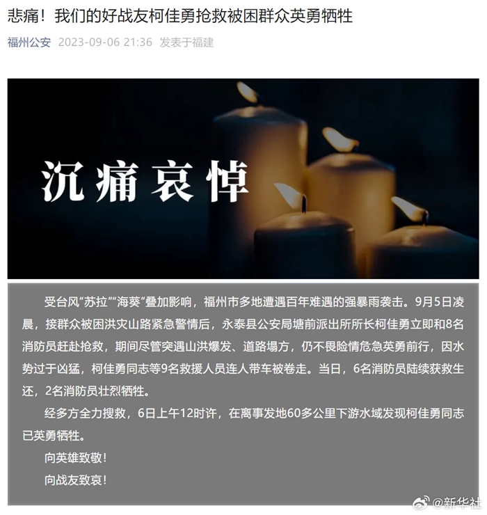 受臺風“蘇拉”“海葵”疊加影響,福州市多地遭遇百年難遇的強暴雨襲擊。9月5日凌晨,接群眾被困洪災山路緊急警情后,永泰縣公安局塘前派出所所長柯佳勇立即和8名消防員趕赴搶救,期間盡管突遇山洪暴發(fā)、道路塌方,仍不畏險情危急英勇前行,因水勢過于兇猛,柯佳勇同志等9名救援人員連人帶車被卷走。當日,6名消防員陸續(xù)獲救生還,2名消防員壯烈犧牲。經多方全力搜救,6日上午12時許,在離事發(fā)地60多公里下游水域發(fā)現柯佳勇同志已英勇犧牲。(記者:王成 來源:福州公安)