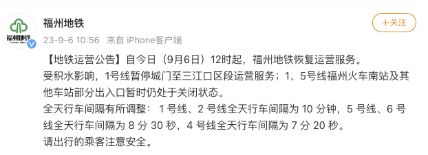 福州地鐵9月6日12時起恢復運營服務