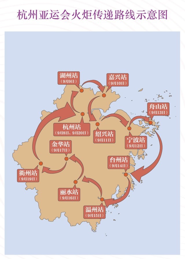 杭州首日的傳遞結(jié)束之后,就將開啟浙江全省的傳遞,遍布11個地市,9月20日將回到杭州并完成最后一站傳遞。