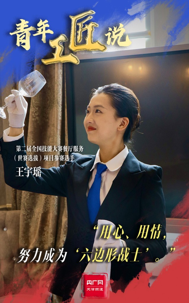 370余個(gè)考核點(diǎn),對(duì)于第二屆全國(guó)技能大賽餐廳服務(wù)(世賽選拔)項(xiàng)目參賽選手王宇瑤來說,有著巨大的考驗(yàn)。但面對(duì)困難,王宇瑤始終保持微笑,在老師的指導(dǎo)下練習(xí)調(diào)制雞尾酒、餐巾折花、餐桌擺盤成百上千次。整齊的著裝、得體大方的儀容、神采奕奕的狀態(tài),一顰一笑皆為王宇瑤的細(xì)心巧思?!拔覍⒁源舜伪荣悶槠鯔C(jī),努力磨煉技藝,成為一名全面發(fā)展的‘六邊形戰(zhàn)士’?!蓖跤瞵幮χf道。