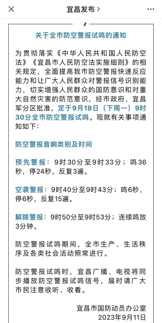 據(jù)宜昌市國防動員辦公室通知,宜昌市定于9月18日9時30分全市防空警報試鳴。