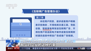 中國法學會消費者權(quán)益保護法研究會副秘書長 陳音江:廣告法里面規(guī)定得就比較粗一些,任何單位或個人,你沒有經(jīng)過當事人的同意,不能夠向這種住宅或者說交通設施上去投放廣告,但是用的是“等”,就沒有這么具體。修訂實施的《互聯(lián)網(wǎng)廣告管理辦法》里面,它就明確地說了包括智能家電,你沒有經(jīng)過同意,你也不能夠往它里面去發(fā)送這種廣告。這幾年,針對智能家電的這種廣告它的規(guī)定越來越具體,那么對企業(yè)的這種約束也應該是越來越具體,或者說它這種合規(guī)的紅線越來越明確。