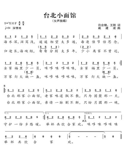 歌曲《臺(tái)北小面館》圍繞中華民族唇齒相依、骨肉相連一家親,海峽兩岸一脈相承、血濃于水一家人的熾熱情感為主線,歌詞通過“海水深,淚窩淺”“歸途長,海峽短”,抒發(fā)了同胞隔海相望的濃濃思念之情,以及“每逢佳節(jié)倍思念”“少小離家不曾還”,傾訴著親人渴望團(tuán)圓的深深相思。