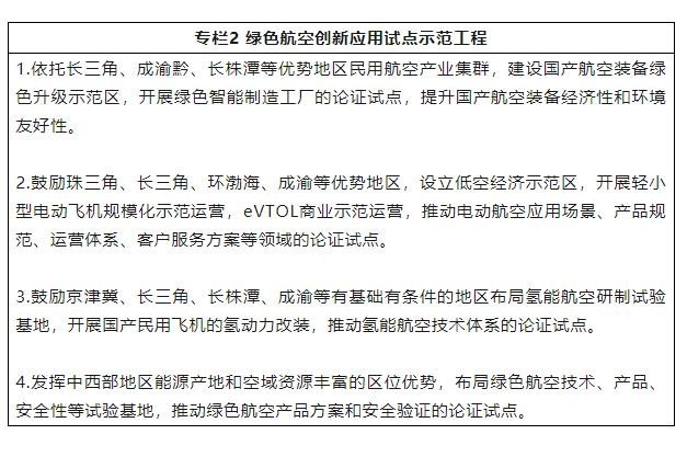7.推動新能源航空器區(qū)域應用試點示范。依托優(yōu)勢地區(qū),建設(shè)國產(chǎn)航空裝備綠色升級示范區(qū)。鼓勵各地區(qū)結(jié)合區(qū)域經(jīng)濟發(fā)展基礎(chǔ)和需求,開展電動通航飛機、eVTOL試點示范應用,探索技術(shù)和裝備體系、應用場景、商業(yè)運營新模式。鼓勵有基礎(chǔ)有條件的地區(qū)布局綠色航空關(guān)鍵技術(shù)、產(chǎn)品方案、安全驗證等試驗基地。