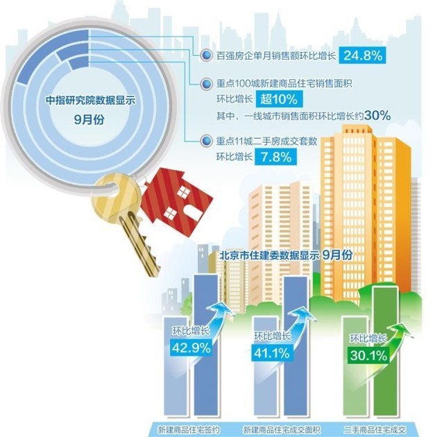 隨著需求釋放動能減弱,9月后兩周成交量明顯下降。北京市住建委數據顯示,9月份,北京新建商品住宅簽約5891套,成交面積67.96萬平方米,環(huán)比分別增長42.9%和41.1%;二手商品住宅成交14262套,環(huán)比增長30.1%。
