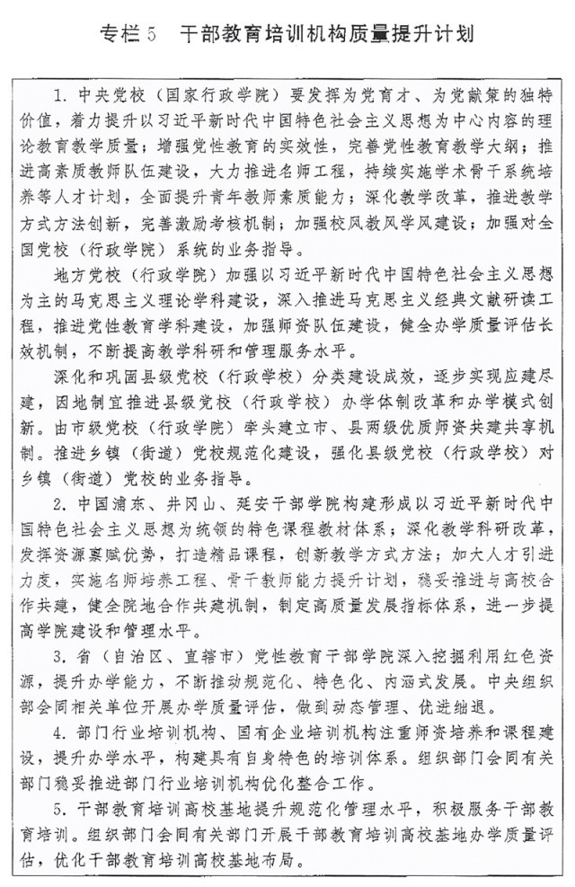?。ㄒ唬┡嘤?xùn)機(jī)構(gòu)建設(shè)。推進(jìn)各級(jí)黨校(行政學(xué)院)建設(shè),以教學(xué)督導(dǎo)、師資培養(yǎng)、質(zhì)量評(píng)估為重點(diǎn),強(qiáng)化上級(jí)黨校(行政學(xué)院)對(duì)下級(jí)黨校(行政學(xué)院)的業(yè)務(wù)指導(dǎo),不斷提高辦學(xué)水平。推進(jìn)縣級(jí)黨校(行政學(xué)校)分類建設(shè)。加強(qiáng)社會(huì)主義學(xué)院建設(shè)。進(jìn)一步提升部門行業(yè)培訓(xùn)機(jī)構(gòu)、國(guó)有企業(yè)培訓(xùn)機(jī)構(gòu)辦學(xué)質(zhì)量。加強(qiáng)對(duì)干部教育培訓(xùn)高?;?、基層干部教育培訓(xùn)機(jī)構(gòu)辦學(xué)指導(dǎo)。開展黨校(行政學(xué)院)、?。ㄗ灾螀^(qū)、直轄市)黨性教育干部學(xué)院、干部教育培訓(xùn)高?;剞k學(xué)質(zhì)量評(píng)估。加強(qiáng)各類黨員干部教育培訓(xùn)機(jī)構(gòu)規(guī)范管理,嚴(yán)控新設(shè)以黨員干部為培訓(xùn)對(duì)象的培訓(xùn)機(jī)構(gòu)。支持地方、部門聯(lián)合開展培訓(xùn),鼓勵(lì)干部教育培訓(xùn)機(jī)構(gòu)開展區(qū)域協(xié)作交流,推動(dòng)優(yōu)質(zhì)培訓(xùn)資源共享。實(shí)施干部教育培訓(xùn)機(jī)構(gòu)質(zhì)量提升計(jì)劃(專欄5)。
