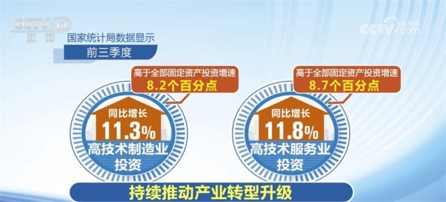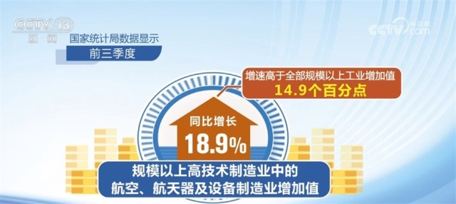 高技術(shù)產(chǎn)業(yè)投資動(dòng)力強(qiáng)勁,新動(dòng)能領(lǐng)域保持較快增長(zhǎng)。國(guó)家統(tǒng)計(jì)局?jǐn)?shù)據(jù)顯示,前三季度,高技術(shù)制造業(yè)投資和高技術(shù)服務(wù)業(yè)投資分別同比增長(zhǎng)11.3%和11.8%,分別高于全部固定資產(chǎn)投資增速8.2和8.7個(gè)百分點(diǎn),持續(xù)推動(dòng)產(chǎn)業(yè)轉(zhuǎn)型升級(jí)。規(guī)模以上高技術(shù)制造業(yè)中的航空、航天器及設(shè)備制造業(yè)增加值同比增長(zhǎng)18.9%,增速高于全部規(guī)模以上工業(yè)增加值14.9個(gè)百分點(diǎn)。