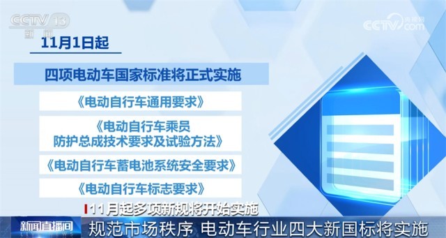 11月1日起,四項電動車國家標(biāo)準(zhǔn)將正式實施,分別是《電動自行車通用要求》《電動自行車乘員防護(hù)總成技術(shù)要求及試驗方法》《電動自行車蓄電池系統(tǒng)安全要求》以及《電動自行車標(biāo)志要求》。這些標(biāo)準(zhǔn)對電動車的設(shè)計制造、安全性能、電池系統(tǒng)和標(biāo)識等方面都提出了明確規(guī)定,涉及電動車的車把、鋰電池、總線設(shè)計、電子控制系統(tǒng)等。