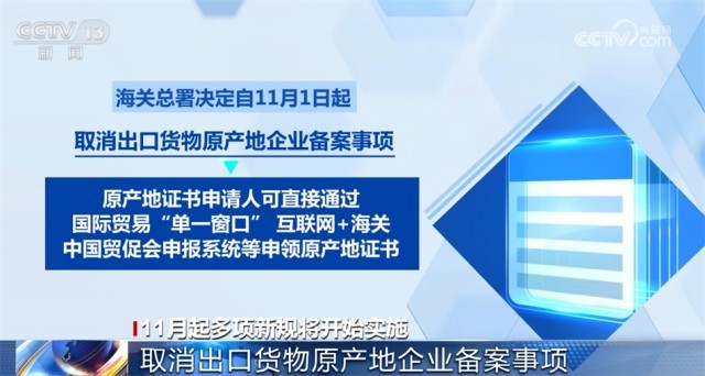 海關(guān)總署決定自11月1日起,取消出口貨物原產(chǎn)地企業(yè)備案事項,原產(chǎn)地證書申請人可直接通過國際貿(mào)易“單一窗口”“互聯(lián)網(wǎng)+海關(guān)”、中國貿(mào)促會申報系統(tǒng)等申領(lǐng)原產(chǎn)地證書,進(jìn)一步優(yōu)化跨境貿(mào)易營商環(huán)境,提升貿(mào)易便利。