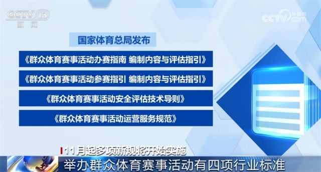 國家體育總局發(fā)布的《群眾體育賽事活動辦賽指南 編制內(nèi)容與評估指引》《群眾體育賽事活動參賽指引 編制內(nèi)容與評估指引》《群眾體育賽事活動安全評估技術(shù)導(dǎo)則》《群眾體育賽事活動運(yùn)營服務(wù)規(guī)范》四項體育行業(yè)標(biāo)準(zhǔn)自11月1日起實施。這些標(biāo)準(zhǔn)明確了群眾體育賽事活動安全評估的流程、策劃、實施和總結(jié),運(yùn)營服務(wù)的基本要求、服務(wù)要求、管理要求等內(nèi)容,適用于各級各類群眾體育賽事活動的舉辦。