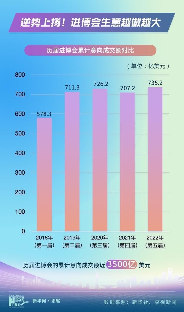 2018年11月,首屆進(jìn)博會在上?!俺踉囂渎暋?。之后,進(jìn)博會不顧風(fēng)雨和險阻,年年如約而至、越辦越好。數(shù)據(jù)顯示,進(jìn)博會的累計意向成交額從2018年的578.3億美元,上升到2022年的735.2億美元。前五屆進(jìn)博會的累計意向成交額近3500億美元。進(jìn)博會生意越做越大。