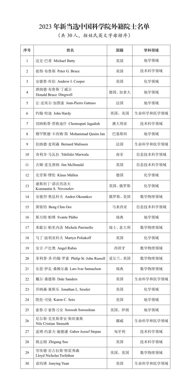 中國青年報(bào)客戶端北京11月23日電(中青報(bào)·中青網(wǎng)見習(xí)記者 楊潔 記者 邱晨輝)今天,中國科學(xué)院、中國工程院分別公布2023年院士增選當(dāng)選外籍院士名單,中國科學(xué)院選舉產(chǎn)生30名外籍院士,中國工程院選舉產(chǎn)生16名外籍院士,共計(jì)46人當(dāng)選。