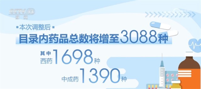此次調(diào)整共新增126種藥品,其中腫瘤用藥21種,新冠、抗感染用藥17種,糖尿病、精神病、風(fēng)濕免疫等慢性病用藥15種,罕見病用藥15種(其中阿伐替尼片同為腫瘤用藥),其他領(lǐng)域用藥59種。同時(shí),調(diào)出了1種即將撤市的藥品。本次調(diào)整后,目錄內(nèi)藥品總數(shù)將增至3088種,其中西藥1698種、中成藥1390種。