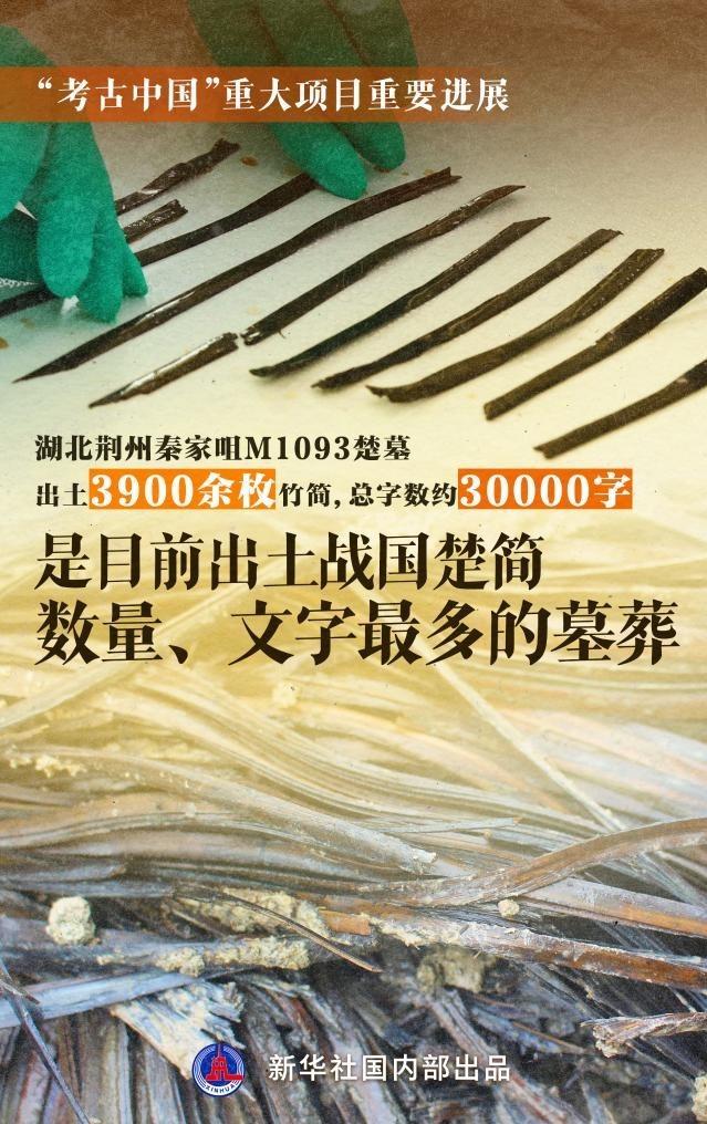 國(guó)家文物局12月21日舉行第四季度例行新聞發(fā)布會(huì),通報(bào)湖北省荊州市秦家咀墓地等4項(xiàng)“考古中國(guó)”重大項(xiàng)目重要進(jìn)展。秦家咀M1093楚墓是目前出土戰(zhàn)國(guó)楚簡(jiǎn)數(shù)量、文字最多的墓葬。