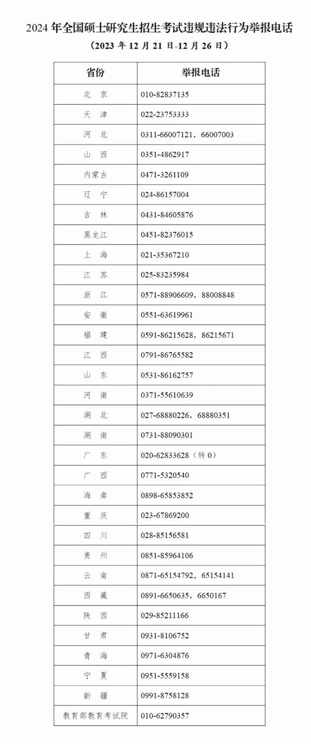 教育部和各?。▍^(qū)、市)教育招生考試機構將開通2024年研考舉報電話,歡迎廣大考生及社會各界人士及時舉報反映有關問題線索。教育部及各?。▍^(qū)、市)將會同有關部門根據(jù)舉報線索第一時間核查處理,堅決維護風清氣正的研考環(huán)境。