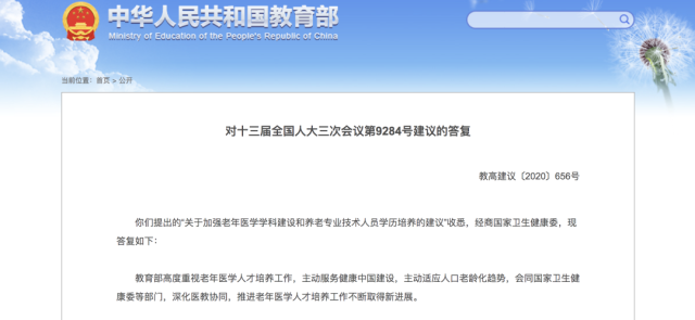 早在2021年,教育部官網(wǎng)曾公布《對(duì)十三屆全國(guó)人大三次會(huì)議第9284號(hào)建議的答復(fù)》,下一步,教育部將進(jìn)一步加強(qiáng)面向全體醫(yī)學(xué)類(lèi)專(zhuān)業(yè)學(xué)生開(kāi)展老年醫(yī)學(xué)教育,同時(shí),協(xié)同國(guó)家衛(wèi)生健康委,鼓勵(lì)高校加強(qiáng)老年醫(yī)學(xué)學(xué)科建設(shè)、推進(jìn)老年醫(yī)學(xué)專(zhuān)科醫(yī)師規(guī)范化培訓(xùn)。