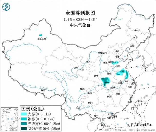 中央氣象臺1月5日06時繼續(xù)發(fā)布大霧黃色預警