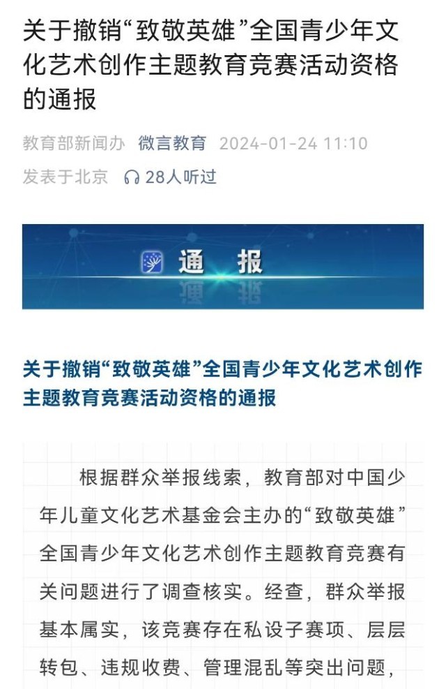 教育部1月24日通報(bào),根據(jù)群眾舉報(bào)線索,教育部對(duì)中國(guó)少年兒童文化藝術(shù)基金會(huì)主辦的“致敬英雄”全國(guó)青少年文化藝術(shù)創(chuàng)作主題教育競(jìng)賽有關(guān)問(wèn)題進(jìn)行了調(diào)查核實(shí)。經(jīng)查,群眾舉報(bào)基本屬實(shí),該競(jìng)賽存在私設(shè)子賽項(xiàng)、層層轉(zhuǎn)包、違規(guī)收費(fèi)、管理混亂等突出問(wèn)題,在社會(huì)上造成了惡劣影響。