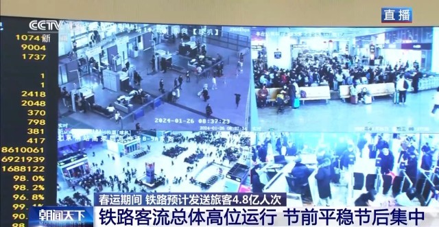 總臺央視記者 陳晰:40天春運,全國鐵路預計發(fā)送旅客4.8億人次,日均1200萬人次。今天是春運首日,全國鐵路預計發(fā)送旅客1060萬人次。2024年春運的火車票預售已經(jīng)從1月12日開始發(fā)售,從目前的售票情況來看,旅客出行需求旺盛。