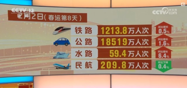 具體來看,2月2日,鐵路客運量1213.8萬人次,環(huán)比增長0.5%;公路人員流動量18519萬人次,環(huán)比增長1.6%;水路客運量59.4萬人次,環(huán)比增長6.4%;民航客運量209.8萬人次,環(huán)比下降0.4%。