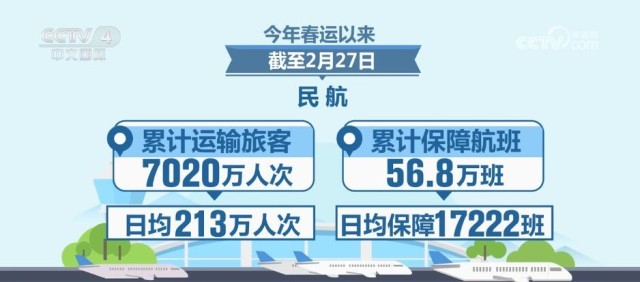 1月份,民航全行業(yè)完成運輸總周轉(zhuǎn)量116.1億噸公里,同比增長57.1%;完成旅客運輸量5731.8萬人次,同比增長44.1%,民航客運恢復(fù)程度達到疫情以來月度新高;完成貨郵運輸量75.3萬噸,同比增長53.9%,民航貨運規(guī)模連續(xù)六個月超過疫情前水平。從數(shù)據(jù)看,今年春運以來,截至2月27日,民航累計運輸旅客7020萬人次,日均213萬人次;累計保障航班56.8萬班,日均保障17222班。