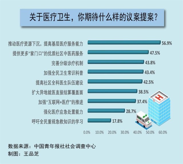 每年全國兩會,醫(yī)療衛(wèi)生都是代表委員們熱議的話題。在全國兩會召開前夕,中國青年報社社會調(diào)查中心聯(lián)合問卷網(wǎng)(wenjuan.com),進行了全國兩會青年期待調(diào)查,共有2002人參與。調(diào)查顯示,在兩會關(guān)于醫(yī)療衛(wèi)生領(lǐng)域的議題中,56.9%的受訪者最期待推動醫(yī)療資源下沉,提高基層醫(yī)療服務(wù)能力,47.5%的受訪者期待提供更多“家門口”的優(yōu)質(zhì)社區(qū)中醫(yī)藥服務(wù)。