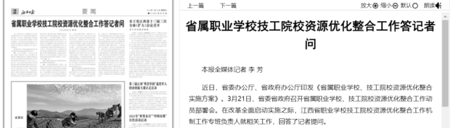 3月24日,《江西日?qǐng)?bào)》發(fā)布了《省屬職業(yè)學(xué)校技工院校資源優(yōu)化整合工作答記者問(wèn)》。