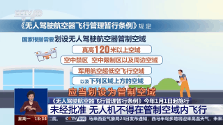 北京航空航天大學航空專家 《航空知識》主編 王亞男:《無人駕駛航空器飛行管理暫行條例》對于無人機使用的空域作出了明確規(guī)定,真高120米以上空域、限制飛行的空域等,劃設(shè)為管制空域。無人機違規(guī)采集影像等數(shù)據(jù)可能危害國家安全,無人機“黑飛”或造成不可估量經(jīng)濟損失。
