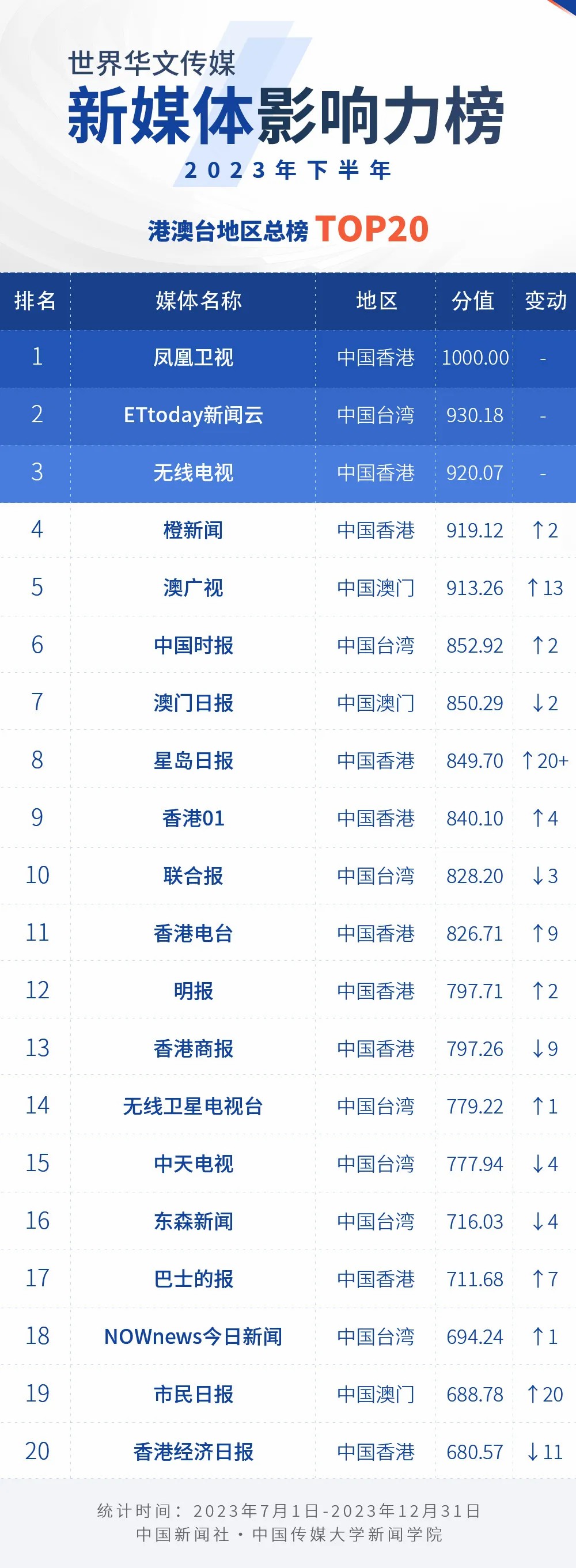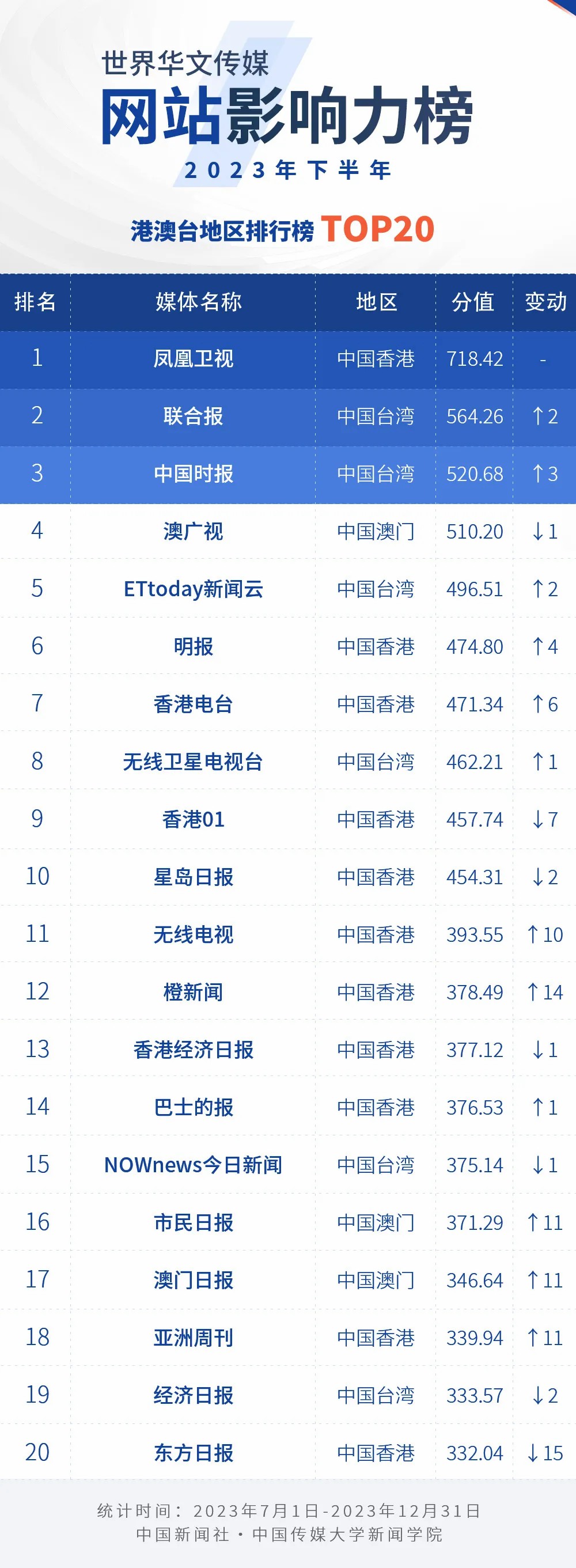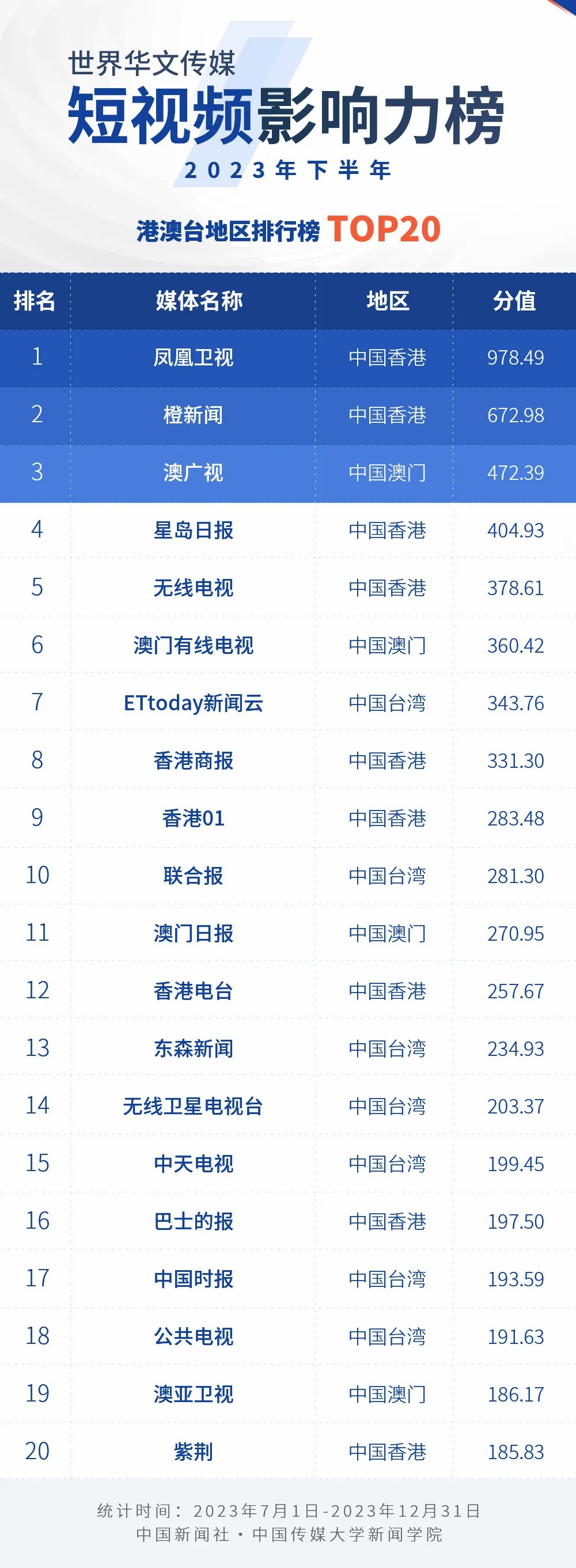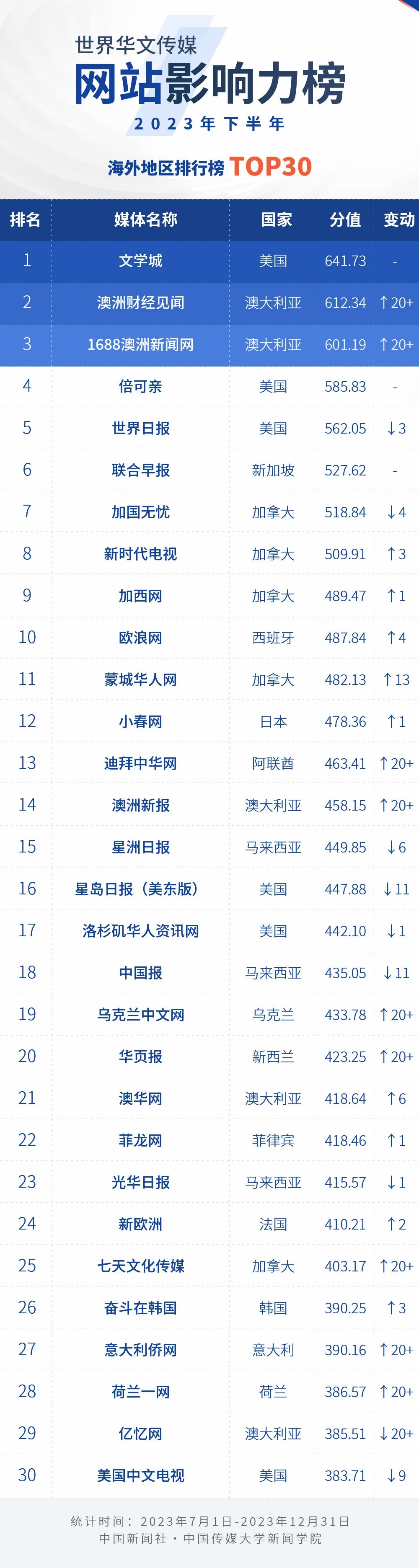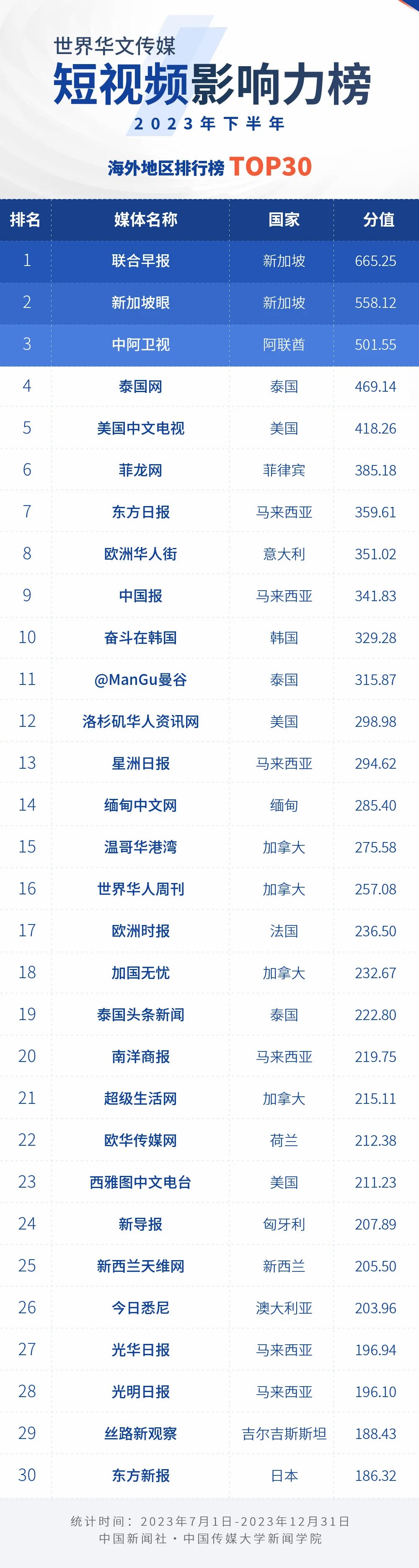 中國(guó)新聞社與中國(guó)傳媒大學(xué)新聞學(xué)院持續(xù)開(kāi)展“世界華文傳媒新媒體影響力”測(cè)評(píng)項(xiàng)目,現(xiàn)根據(jù)2023年下半年世界華文傳媒新媒體的業(yè)務(wù)數(shù)據(jù),發(fā)布2023年下半年榜。