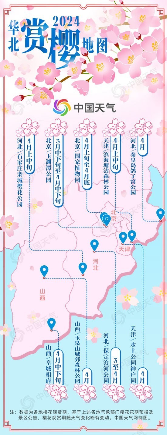 中國天氣網(wǎng)訊 “層層圍珠璣,團團錦繡簇。”伴隨著春天的腳步,華北地區(qū)又迎來一年中最美的賞櫻季。春日盛景不可負,錯過一季就要再等一年!中國天氣網(wǎng)推出2024華北地區(qū)賞櫻地圖,賞櫻勝地花期一圖看盡,邀你共赴一場櫻花之約。