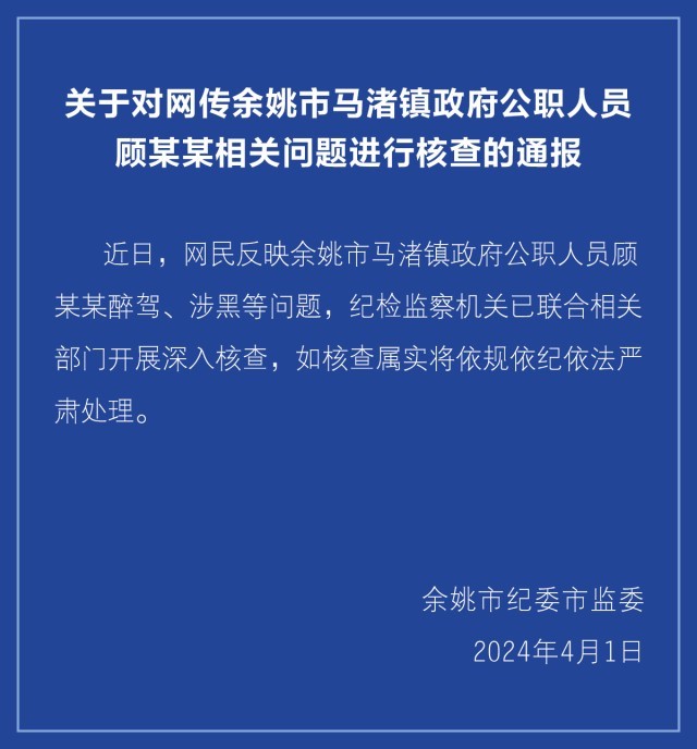 央視網(wǎng)消息:據(jù)浙江余姚市紀委市監(jiān)委,近日,網(wǎng)民反映余姚市馬渚鎮(zhèn)政府公職人員顧某某醉駕、涉黑等問題,紀檢監(jiān)察機關已聯(lián)合相關部門開展深入核查,如核查屬實將依規(guī)依紀依法嚴肅處理。