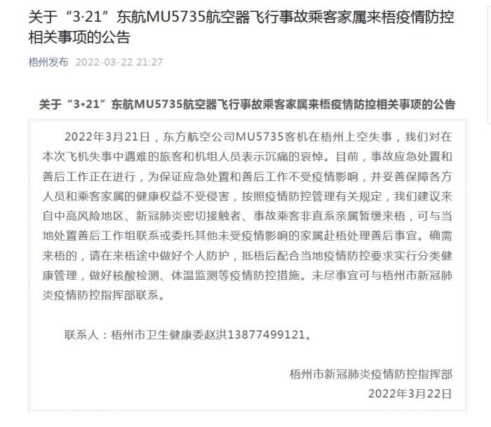 中新網3月22日電 據“梧州發(fā)布”微信公眾號消息,3月22日,梧州市新冠肺炎疫情防控指揮部發(fā)布通告稱,2022年3月21日,東方航空公司MU5735客機在梧州上空失事。目前,事故應急處置和善后工作正在進行,為保證應急處置和善后工作不受疫情影響,并妥善保障各方人員和乘客家屬的健康權益不受侵害,按照疫情防控管理有關規(guī)定,我們建議來自中高風險地區(qū)、新冠肺炎密切接觸者、事故乘客非直系親屬暫緩來梧,可與當地處置善后工作組聯系或委托其他未受疫情影響的家屬赴梧處理善后事宜。