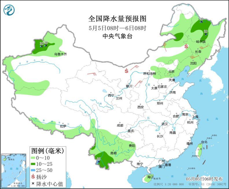 5月5日8時(shí)至6日8時(shí),新疆西北部、內(nèi)蒙古東部、華北中北部、東北地區(qū)大部、西南地區(qū)南部等地的部分地區(qū)有小到中雨,局地有大雨。甘肅河西、內(nèi)蒙古、東北地區(qū)等地有5~7級(jí)風(fēng),部分地區(qū)并伴有浮塵或揚(yáng)沙天氣。渤海、渤海海峽、黃海北部和中西部海域?qū)⒂?~7級(jí)、陣風(fēng)8級(jí)的偏南風(fēng)轉(zhuǎn)東北風(fēng)。