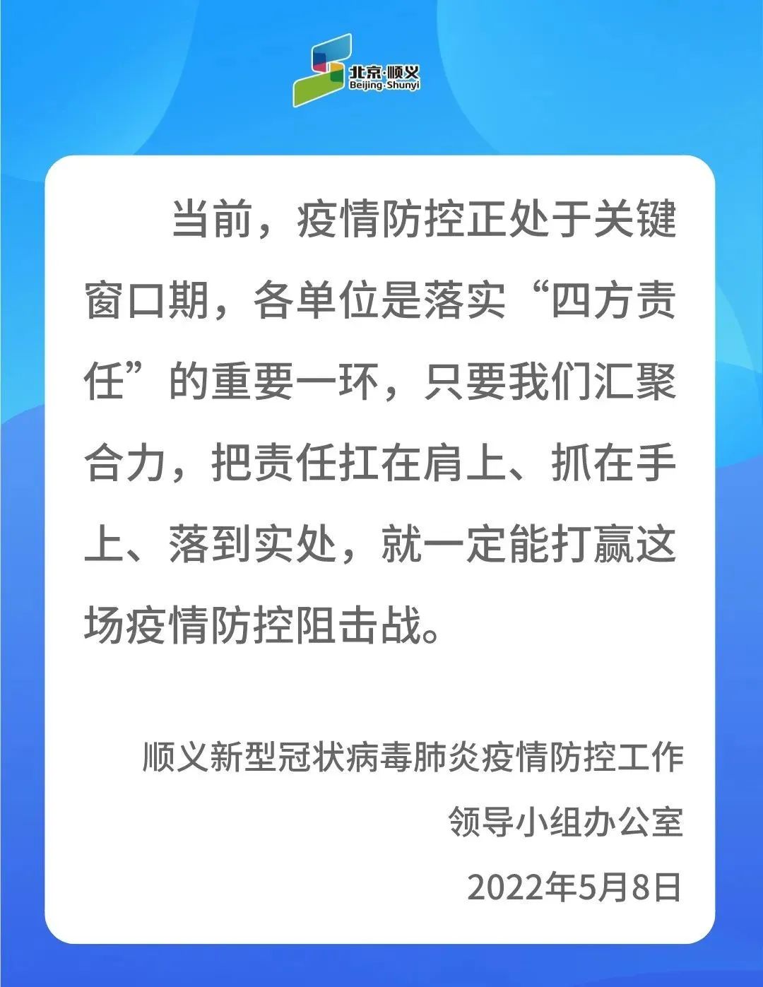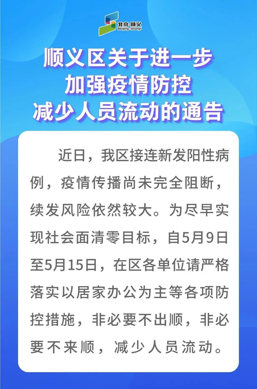 中新網5月8日電 據“北京順義”微信公眾號消息,5月8日,順義區(qū)發(fā)布《順義區(qū)關于進一步加強疫情防控減少人員流動的通告》指出,為盡早實現(xiàn)社會面清零目標,自5月9日至5月15日,在區(qū)各單位請嚴格落實以居家辦公為主等各項防控措施,非必要不出順,非必要不來順,減少人員流動。