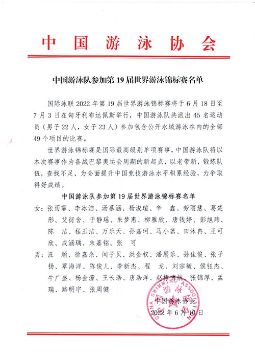 中新網(wǎng)客戶端北京6月10日電 6月10日,中國(guó)游泳協(xié)會(huì)網(wǎng)站公布了中國(guó)游泳隊(duì)參加國(guó)際泳聯(lián)2022年第19屆世界游泳錦標(biāo)賽名單,奧運(yùn)冠軍張雨霏、汪順領(lǐng)銜出戰(zhàn)。