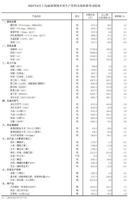 2022年6月上旬流通領(lǐng)域重要生產(chǎn)資料市場(chǎng)價(jià)格變動(dòng)情況。國(guó)家統(tǒng)計(jì)局網(wǎng)站截圖