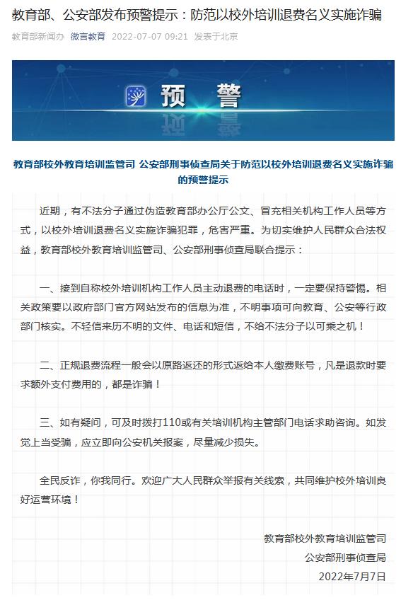 兩部門發(fā)布預警提示:防范以校外培訓退費名義實施詐騙