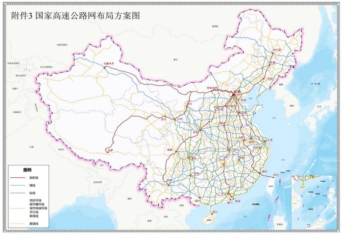國家高速公路網(wǎng)由7條首都放射線、11條北南縱線、18條東西橫線,以及6條地區(qū)環(huán)線、12條都市圈環(huán)線、30條城市繞城環(huán)線、31條并行線、163條聯(lián)絡(luò)線組成。其中,首都放射線包括:北京—哈爾濱、北京—上海、北京—臺北、北京—港澳、北京—昆明、北京—拉薩、北京—烏魯木齊。(中新財經(jīng))