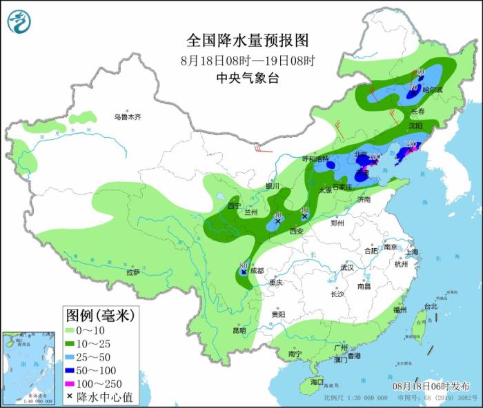 預(yù)計(jì),8月18日08時(shí)至19日08時(shí),黑龍江西南部、吉林西部、遼寧西南部和東部、山西北部、河北中北部、北京、天津、山東北部等地部分地區(qū)有大到暴雨,其中,河北東北部、天津、遼寧東部等地局地有大暴雨(100~180毫米)。上述部分地區(qū)伴有短時(shí)強(qiáng)降水(最大小時(shí)降雨量20~50毫米,局地可超過70毫米),局地有雷暴大風(fēng)等強(qiáng)對(duì)流天氣。中央氣象臺(tái)8月18日06時(shí)繼續(xù)發(fā)布暴雨藍(lán)色預(yù)警。