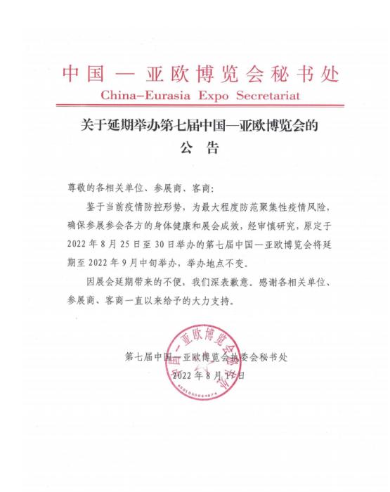8月17日晚,第七屆中國—亞歐博覽會(huì)官網(wǎng)發(fā)布公告,宣布原定于8月25日在烏魯木齊舉辦的第七屆中國—亞歐博覽會(huì)將延期至9月中旬舉辦。通知內(nèi)容如下: