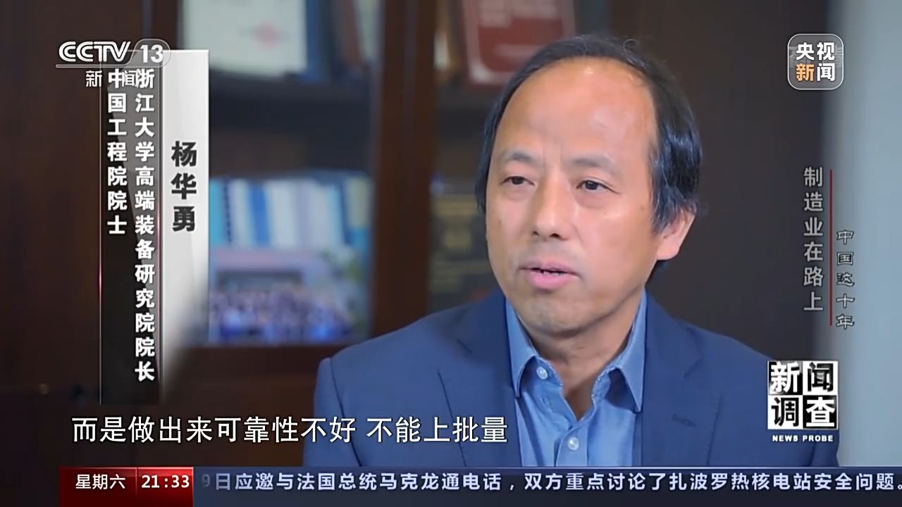 中國(guó)工程院院士 浙江大學(xué)高端裝備研究院院長(zhǎng) 楊華勇:大噸位的起重機(jī)、挖掘機(jī)大量進(jìn)口,咱們就沒有自己的,中國(guó)不是說做不出來,而是做出來可靠性不好,不能上批量。