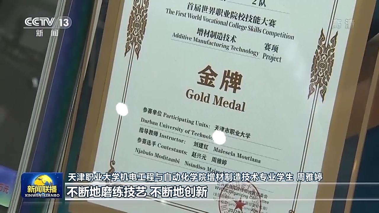 天津職業(yè)大學(xué)機(jī)電工程與自動(dòng)化學(xué)院增材制造技術(shù)專(zhuān)業(yè)學(xué)生 周雅婷:我覺(jué)得我是這個(gè)時(shí)代的幸運(yùn)兒,在(學(xué)校)實(shí)訓(xùn)基地,其實(shí)每天都是實(shí)戰(zhàn),我們的老師也是技能大師。以前我覺(jué)得大國(guó)重器是高不可攀的,當(dāng)我站在世界級(jí)的領(lǐng)獎(jiǎng)臺(tái)上,我才發(fā)現(xiàn),將平凡做到極致,不斷地磨煉技藝、不斷地創(chuàng)新,也是在為制造大國(guó)重器蓄積力量。