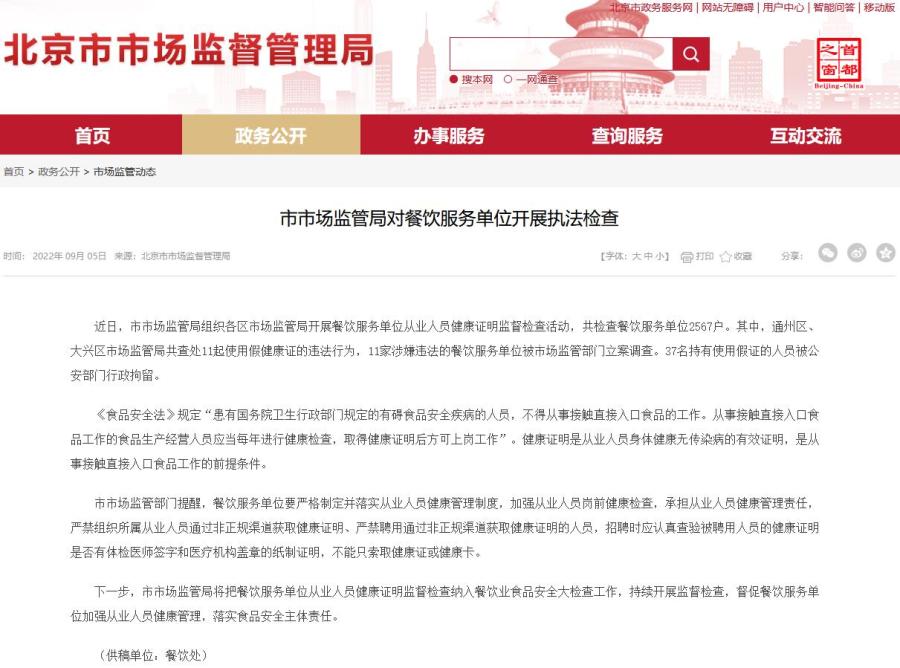 北京查處11起使用假健康證違法行為 37人被行拘