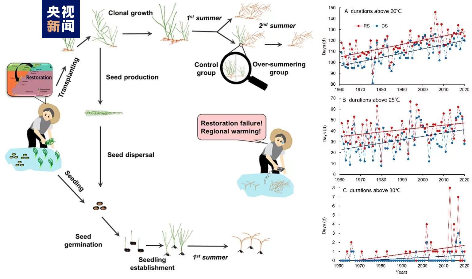 為確定鰻草地理分布北移是否由區(qū)域變暖所致,2016年至2021年期間,科研人員從青島灣獲取鰻草植株和種子,在日照石臼所海域共開展了16次鰻草植株移植和種子種植實驗,監(jiān)測海草生長狀況及水溫等環(huán)境參數(shù),并進行海草生化分析和轉錄組分析。