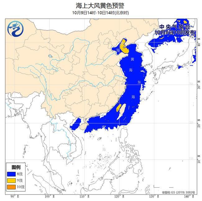 9日午后至10日中午,渤海、渤海海峽、黃海大部海域、東海大部海域、臺灣海峽、臺灣以東洋面、南海北部海域、北部灣將有8~9級、陣風10~11級的大風。