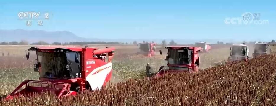 央視網(wǎng)消息:金秋時節(jié),甘肅省張掖市民樂縣的1.2萬畝高粱已經(jīng)成熟了,紅色的高粱和穿梭的聯(lián)合收割機(jī)構(gòu)成一幅色彩艷麗的豐收畫卷。